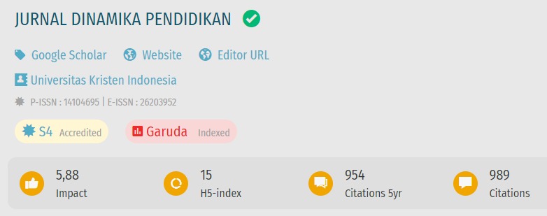 Jurnal Dinamika Pendidikan focused to publish high-quality articles dedicated to all aspects of the latest outstanding research and developments in the fields of Education.This journal with registered number p-ISSN : 1410-4695 and e-ISSN 2620 3952 is a scientific journal which published by Fakultas Keguruan dan Ilmu Pendidikan, Universitas Kristen Indonesia that covered about teaching and learning on educational settings. The aims of Jurnal Dinamika Pendidikan is to disseminate the conceptual thoughts and ideas or research results that have been achieved in the area of education.