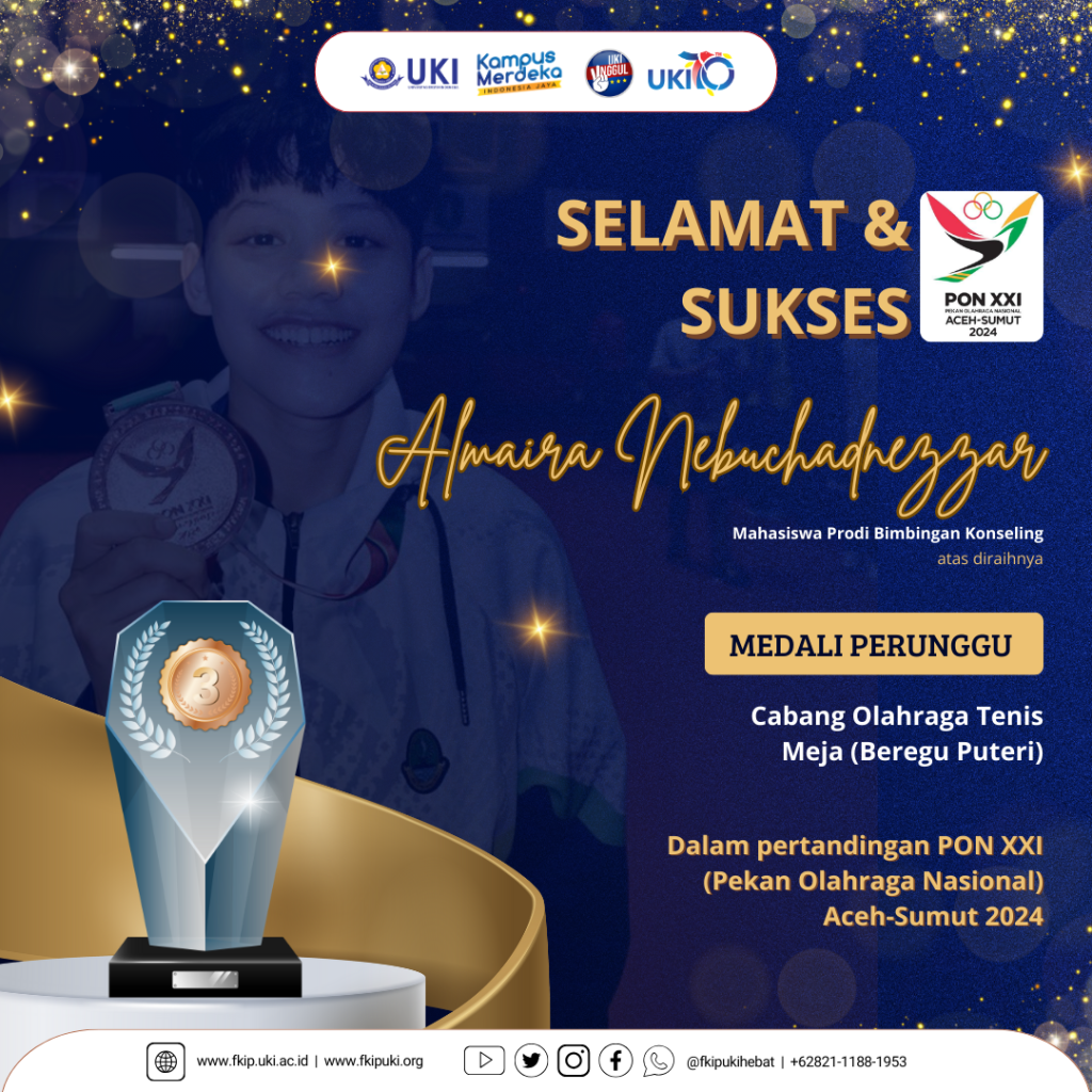 Selamat kepada Almaira Nebuchadnezzar dari Prodi Bimbingan Konseling FKIP UKI yang berhasil meraih Medali Perunggu di ajang PON XXI Aceh-Sumut 2024 untuk cabang Tenis Meja Beregu Puteri!